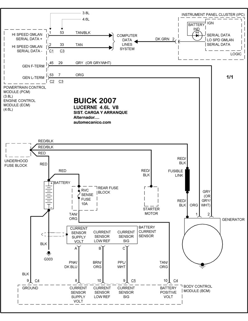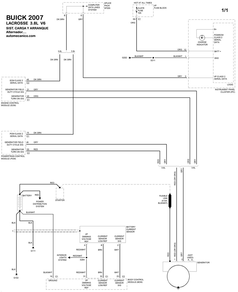 | Los Diagramas, listados abajo, se refieren unicamente al Circuito electrico que involucra: Alternador [Generador] y/o; Arrancador [Motor de arranque, Marcha, Starter] - BUICK 2007 |