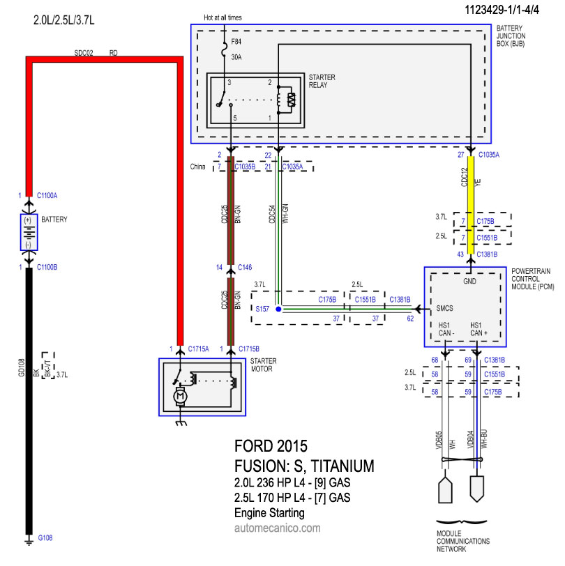 FORD 2015 En estos diagramas se describen los circuitos que conectan y activan el funcionamiento del Arrancador [Starter, motor de arranque] |