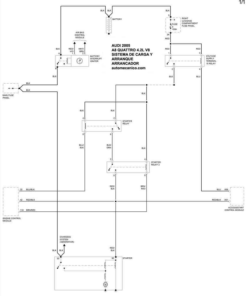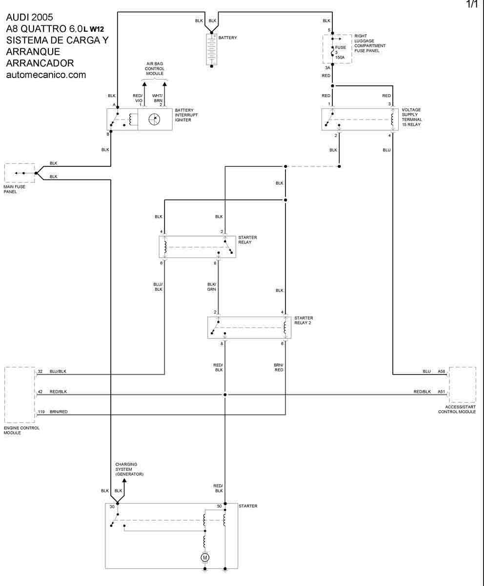 | Los Diagramas, listados abajo, se refieren unicamente al Circuito electrico que involucra: Alternador [Generador] y/o; Arrancador [Motor de arranque, Marcha, Starter] - INDICE: AUDI - 2005- |