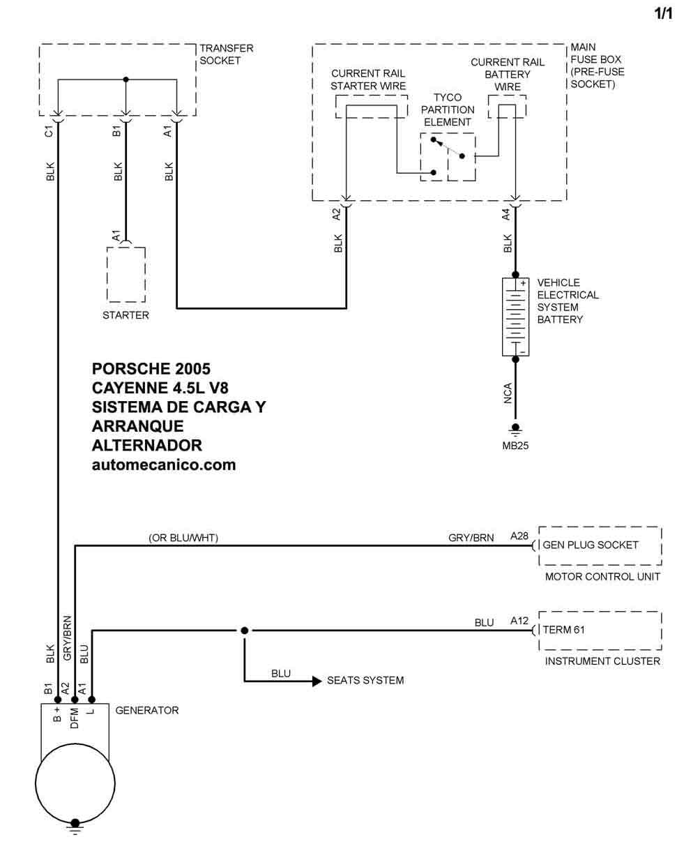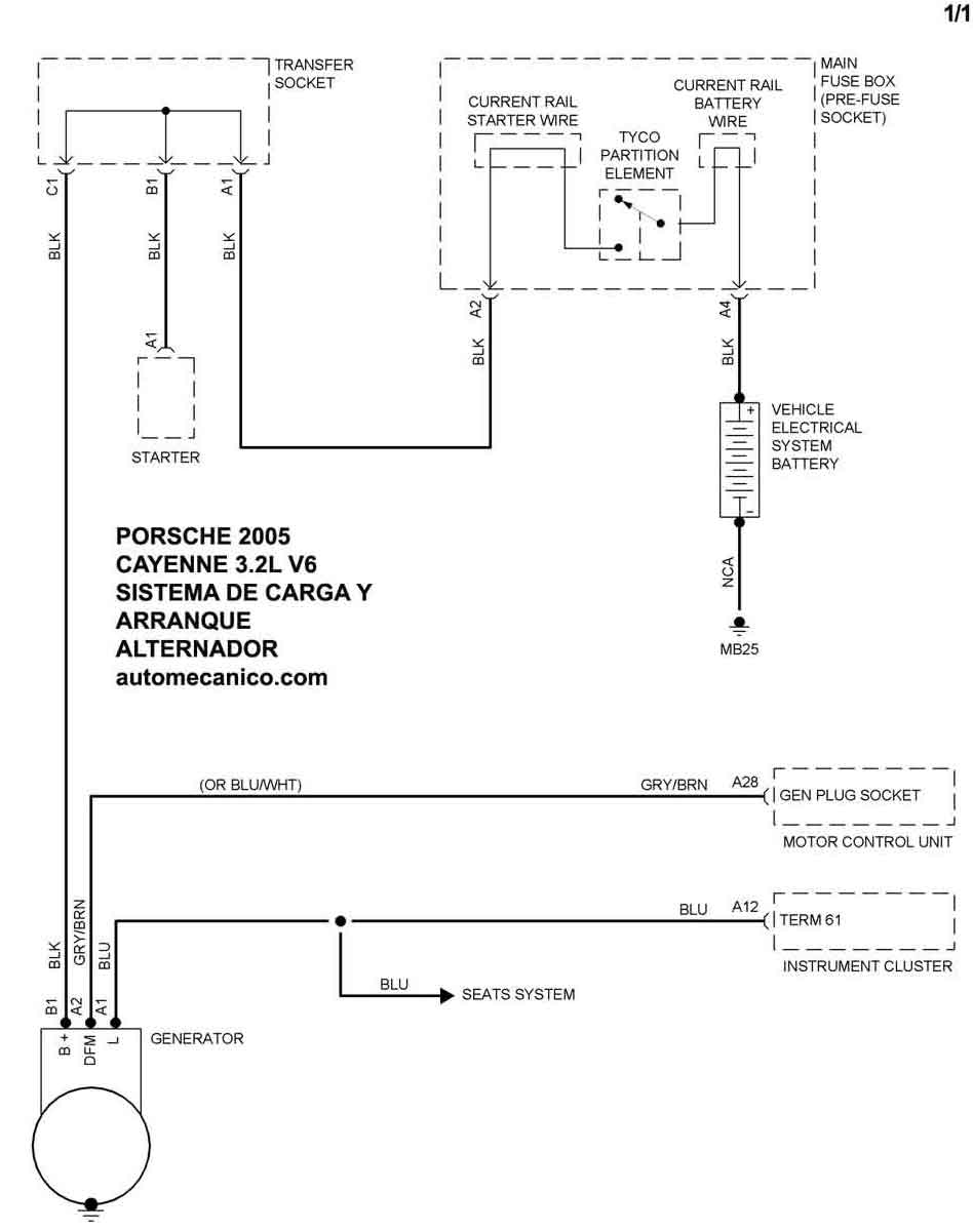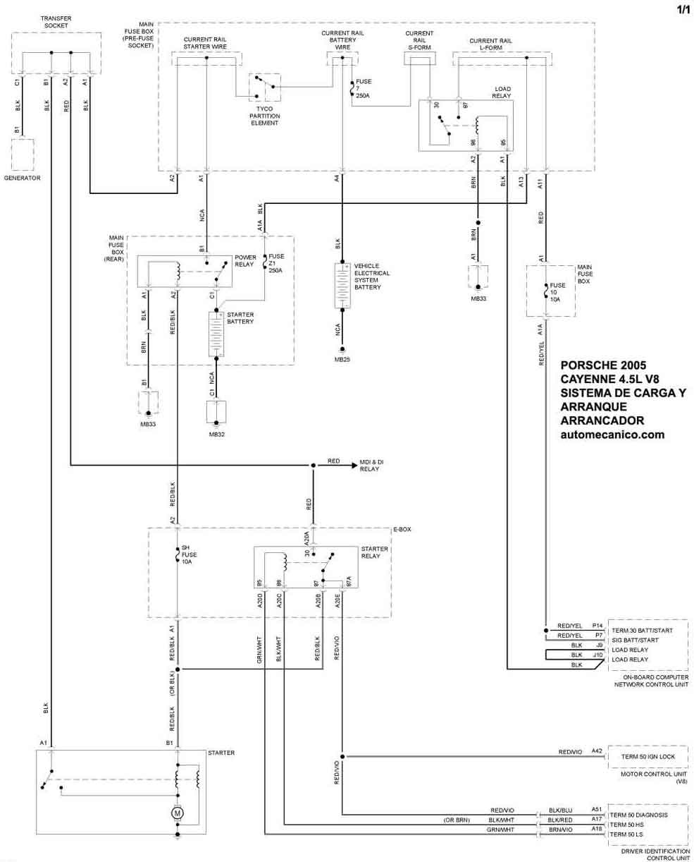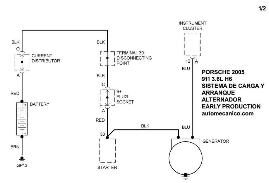 | Los Diagramas, listados abajo, se refieren unicamente al Circuito electrico que involucra: Alternador [Generador] y/o; Arrancador [Motor de arranque, Marcha, Starter] - INDICE: PORSCHE - 2005 - |