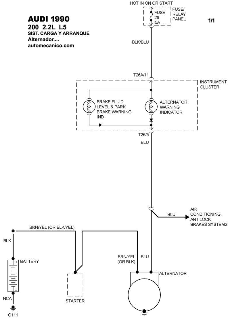 | Los Diagramas, listados abajo, se refieren unicamente al Circuito electrico que involucra: Alternador [Generador] y/o; Arrancador [Motor de arranque, Marcha, Starter] - INDICE: AUDI - 1990 - |