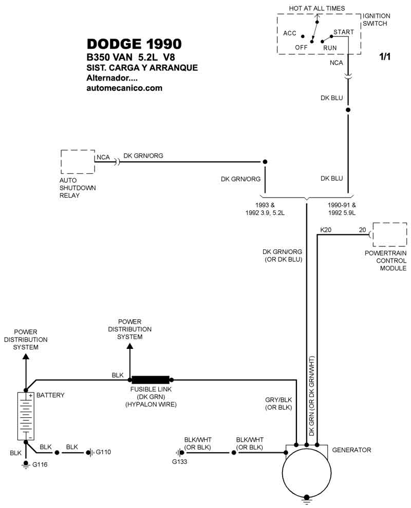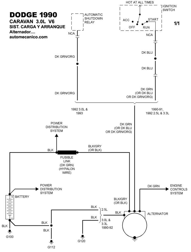 | Los Diagramas, listados abajo, se refieren unicamente al Circuito electrico que involucra: Alternador [Generador] y/o; Arrancador [Motor de arranque, Marcha, Starter] - INDICE: DODGE - 1990 - |