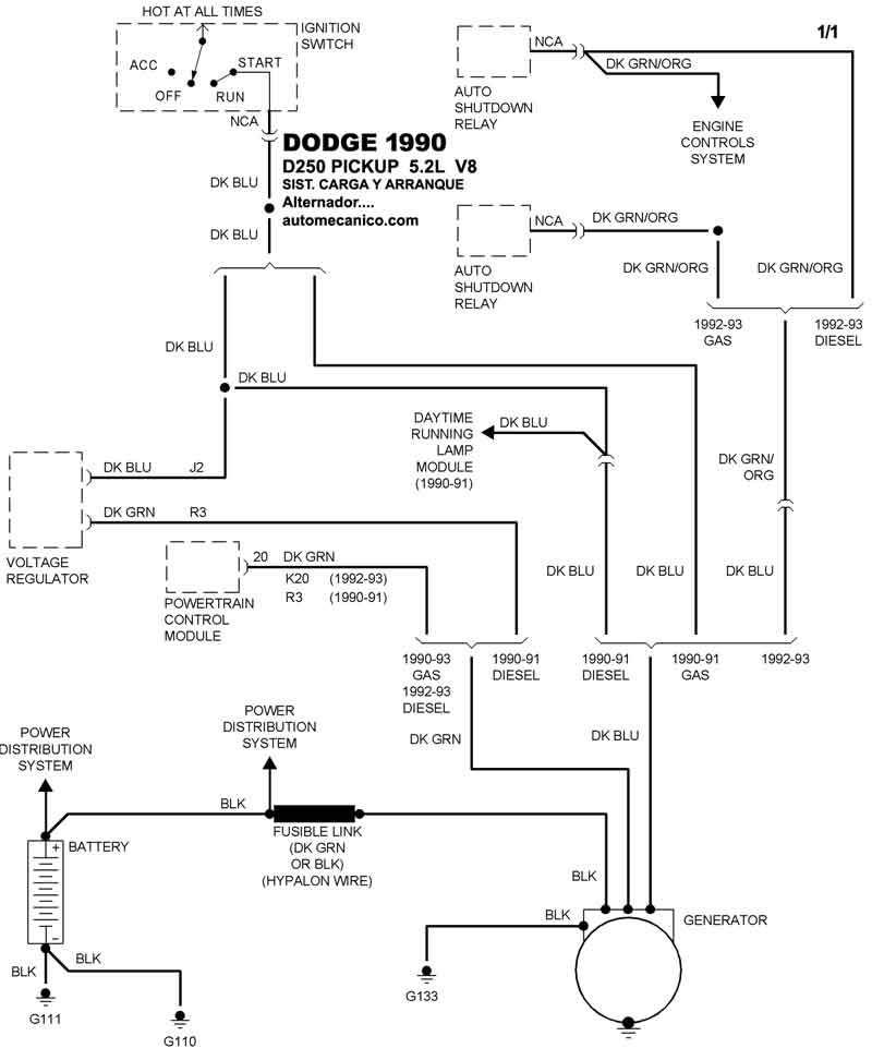 | Los Diagramas, listados abajo, se refieren unicamente al Circuito electrico que involucra: Alternador [Generador] y/o; Arrancador [Motor de arranque, Marcha, Starter] - INDICE: DODGE - 1990 - |
