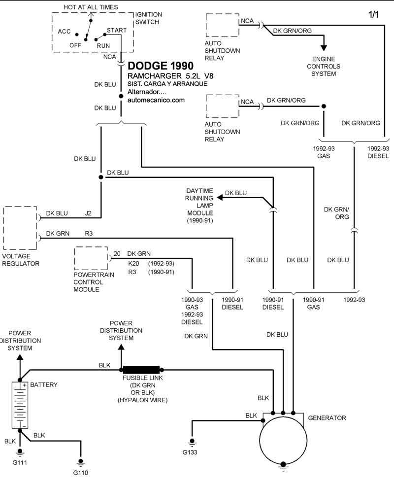 | Los Diagramas, listados abajo, se refieren unicamente al Circuito electrico que involucra: Alternador [Generador] y/o; Arrancador [Motor de arranque, Marcha, Starter] - INDICE: DODGE - 1990 - |