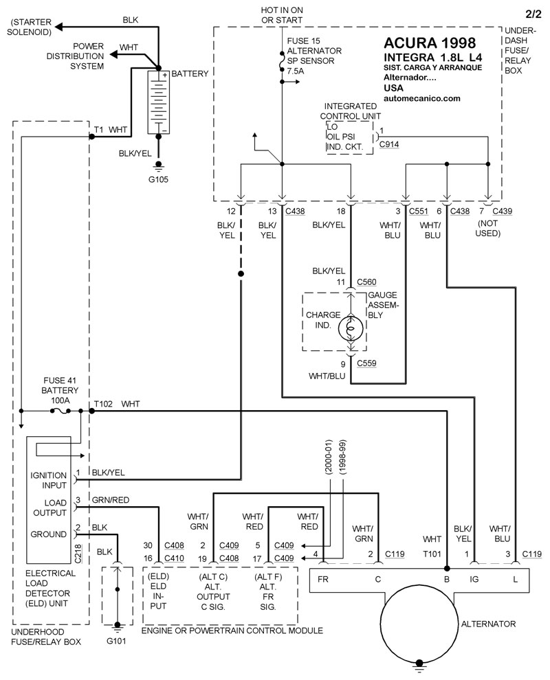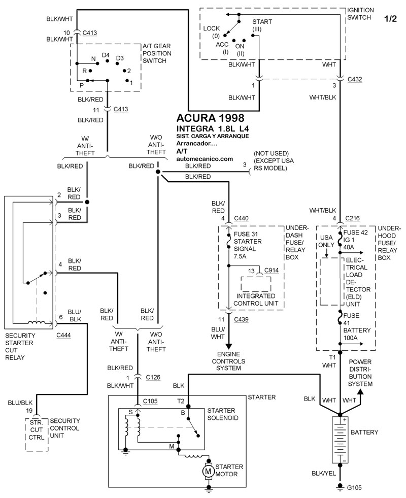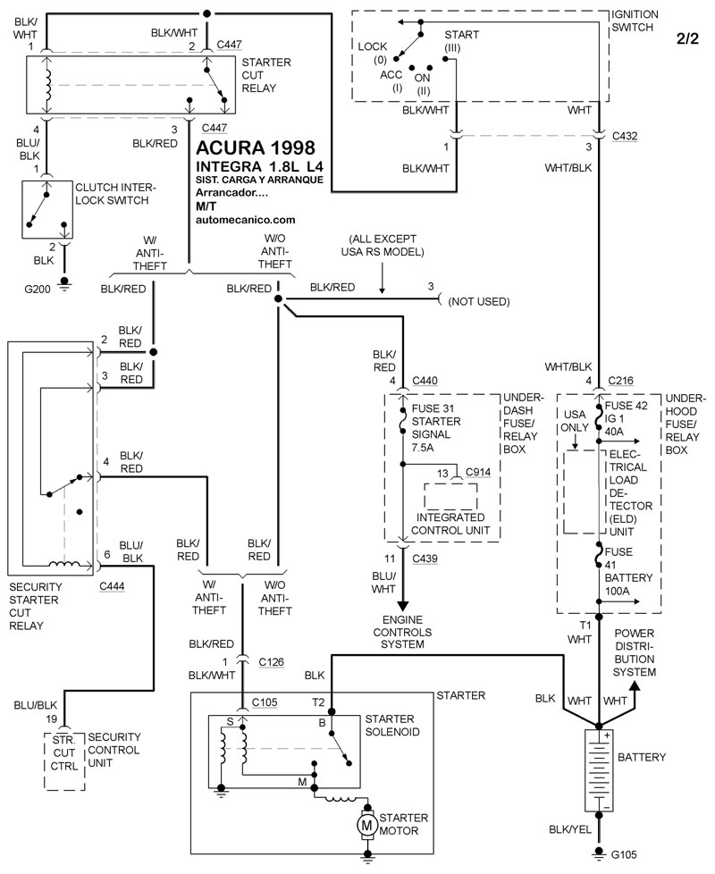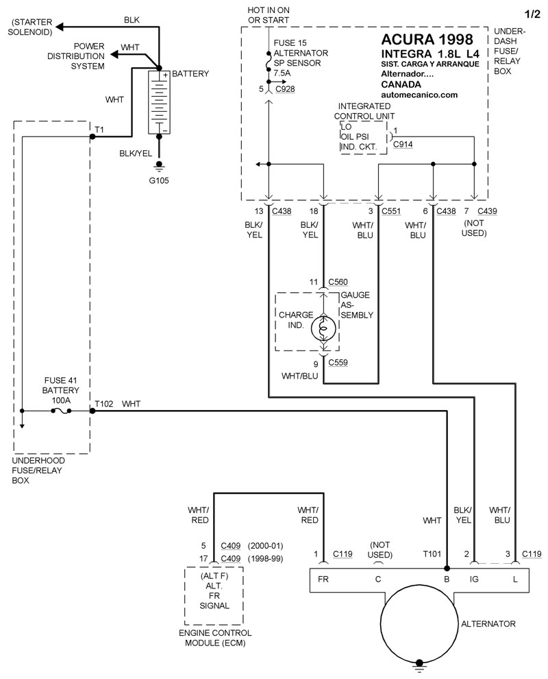 | Los Diagramas, listados abajo, se refieren unicamente al Circuito electrico que involucra: Alternador [Generador] y/o; Arrancador [Motor de arranque, Marcha, Starter] - INDICE: ACURA - 1998 - |