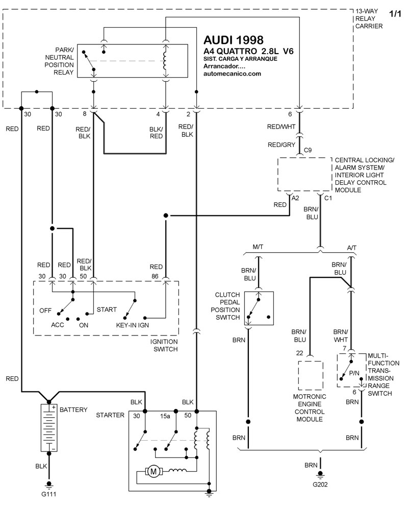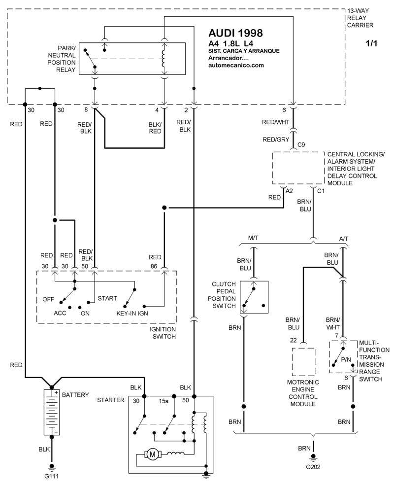 | Los Diagramas, listados abajo, se refieren unicamente al Circuito electrico que involucra: Alternador [Generador] y/o; Arrancador [Motor de arranque, Marcha, Starter] - INDICE: AUDI - 1998 - |