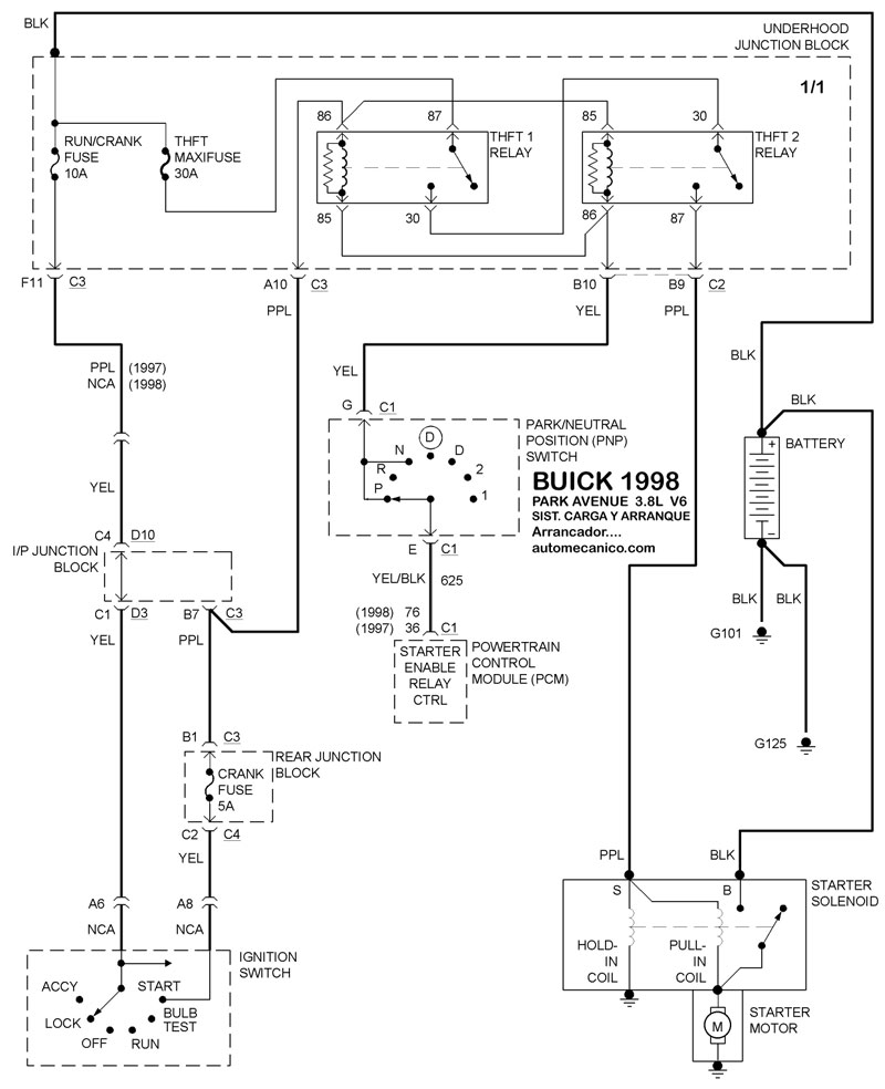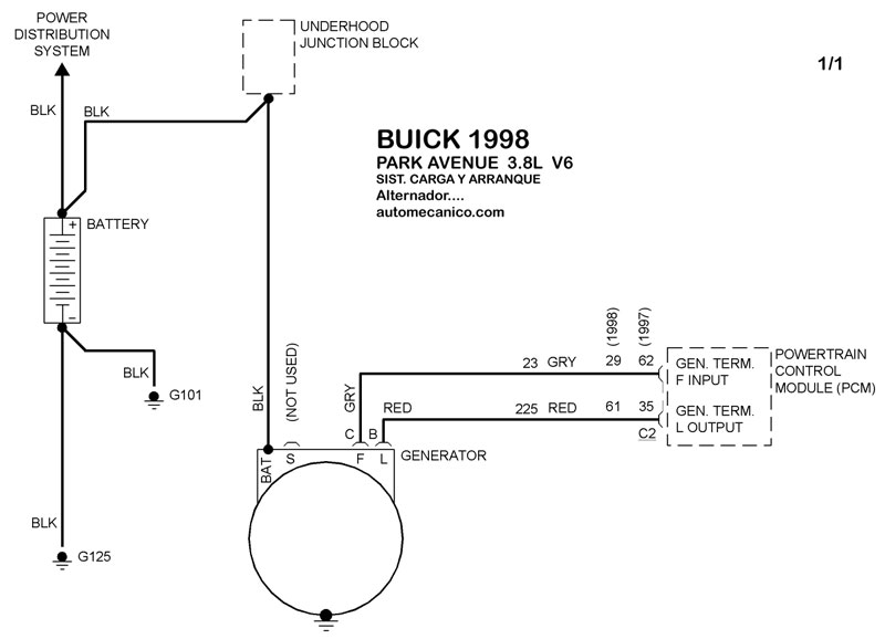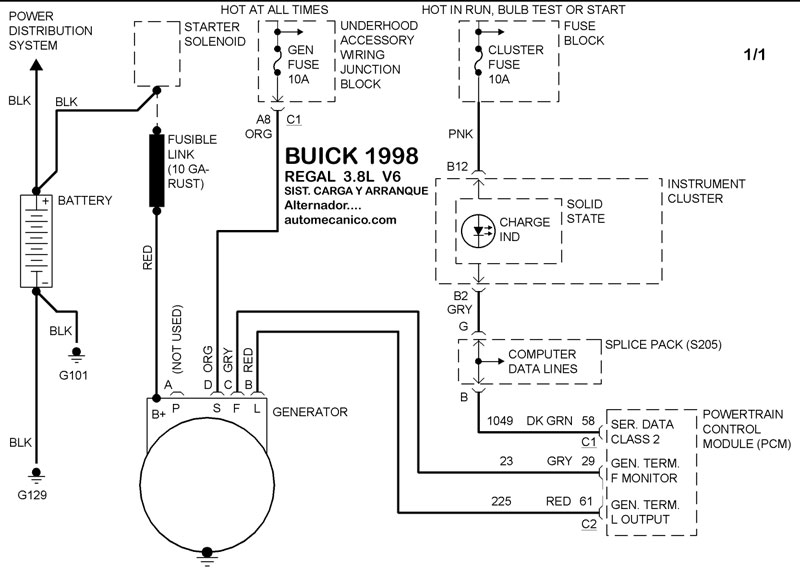 | Los Diagramas, listados abajo, se refieren unicamente al Circuito electrico que involucra: Alternador [Generador] y/o; Arrancador [Motor de arranque, Marcha, Starter] - INDICE: BUICK - 1998 - |