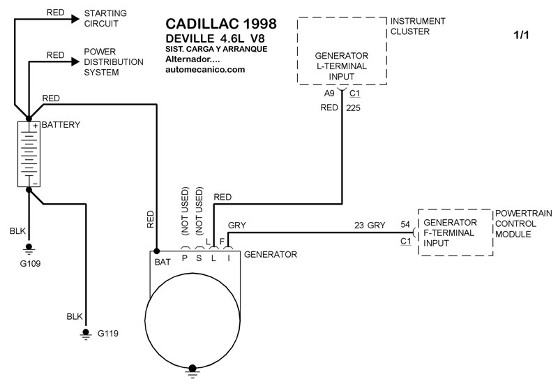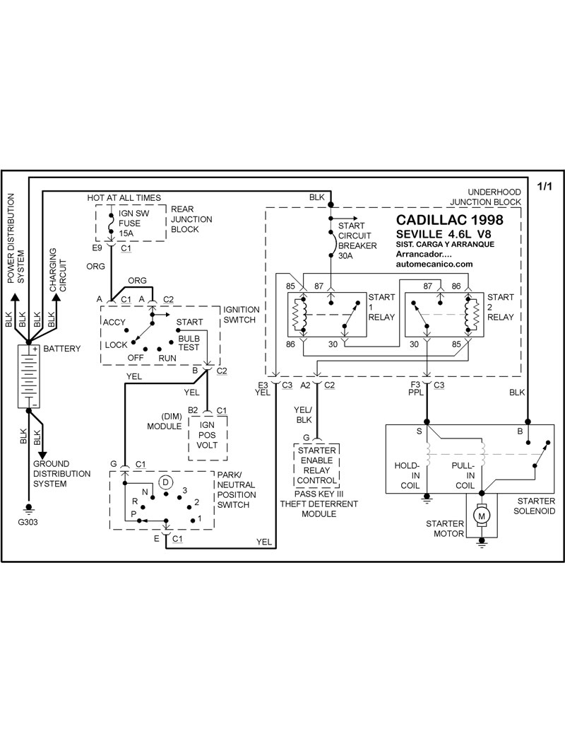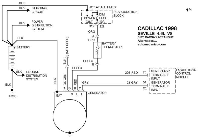 | Los Diagramas, listados abajo, se refieren unicamente al Circuito electrico que involucra: Alternador [Generador] y/o; Arrancador [Motor de arranque, Marcha, Starter] - INDICE: CADILLAC - 1998 - |
