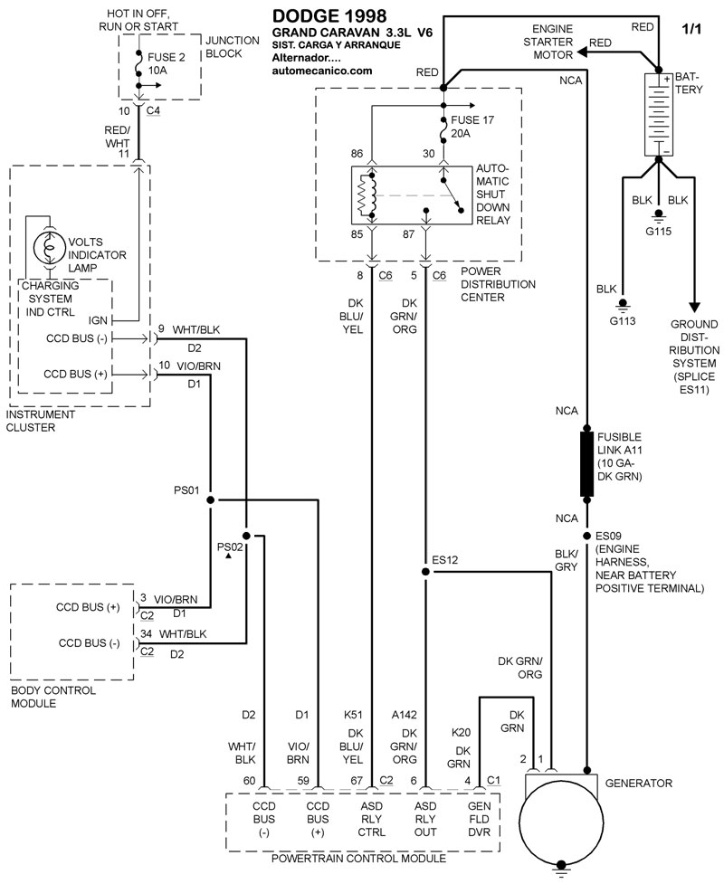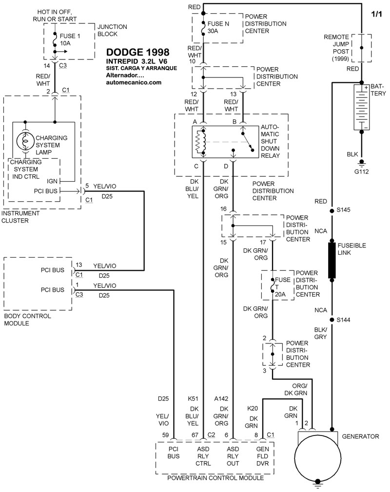 | Los Diagramas, listados abajo, se refieren unicamente al Circuito electrico que involucra: Alternador [Generador] y/o; Arrancador [Motor de arranque, Marcha, Starter] - INDICE: DODGE - 1998 - |
