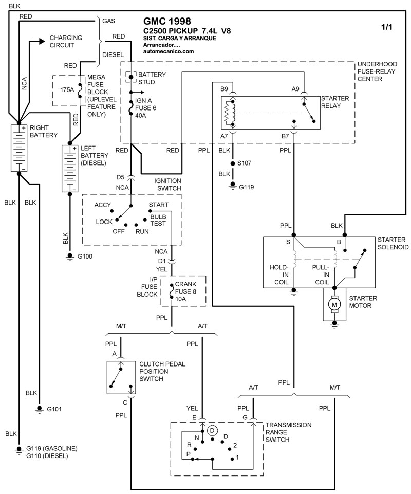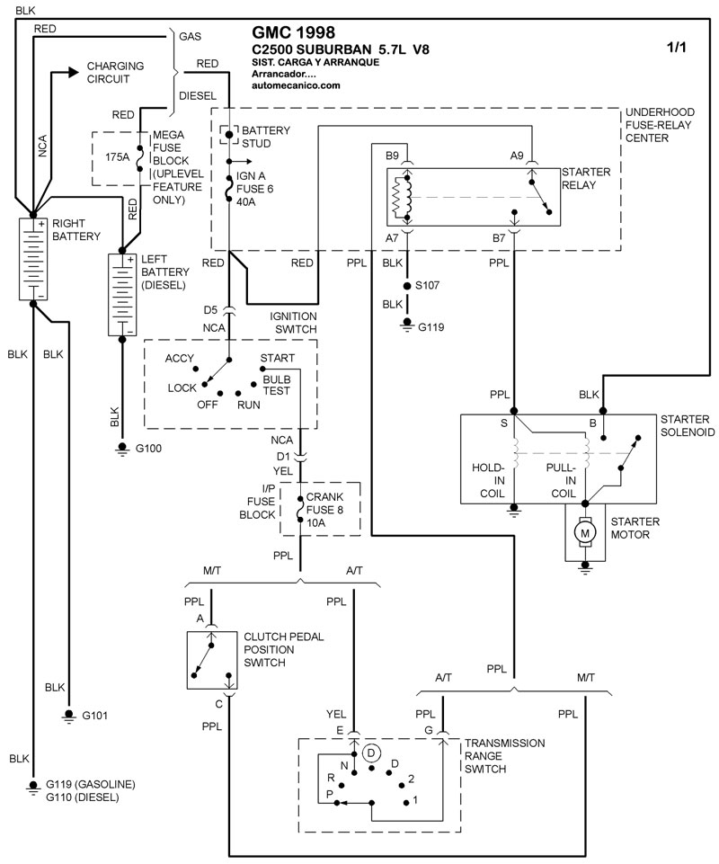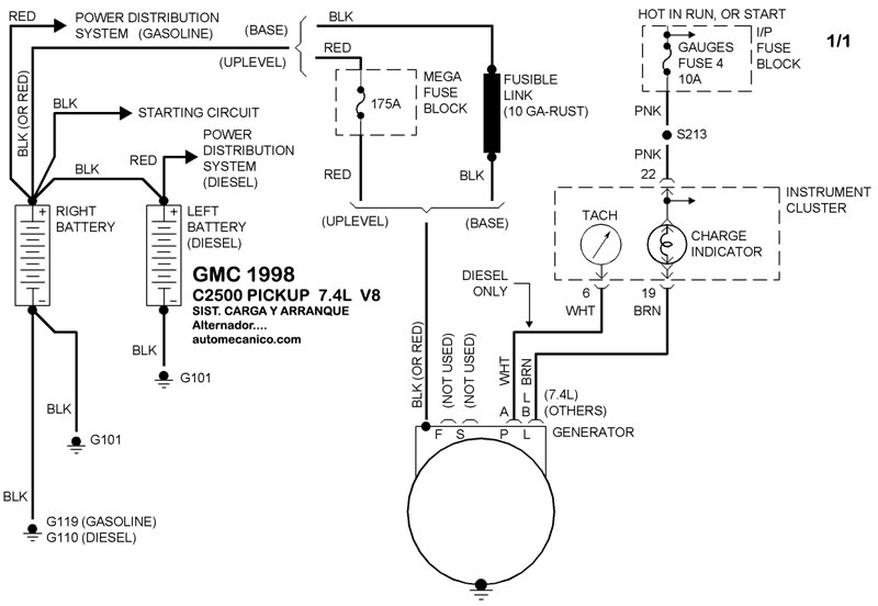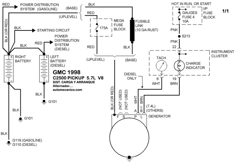 | Los Diagramas, listados abajo, se refieren unicamente al Circuito electrico que involucra: Alternador [Generador] y/o; Arrancador [Motor de arranque, Marcha, Starter] - INDICE: GMC - 1998 - |