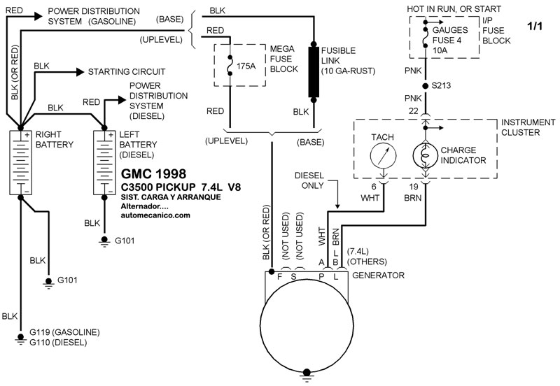 | Los Diagramas, listados abajo, se refieren unicamente al Circuito electrico que involucra: Alternador [Generador] y/o; Arrancador [Motor de arranque, Marcha, Starter] - INDICE: GMC - 1998 - |