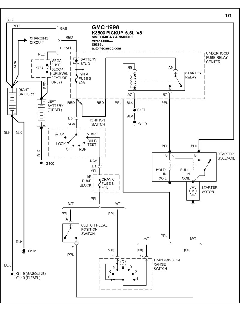 | Los Diagramas, listados abajo, se refieren unicamente al Circuito electrico que involucra: Alternador [Generador] y/o; Arrancador [Motor de arranque, Marcha, Starter] - INDICE: GMC - 1998 - |