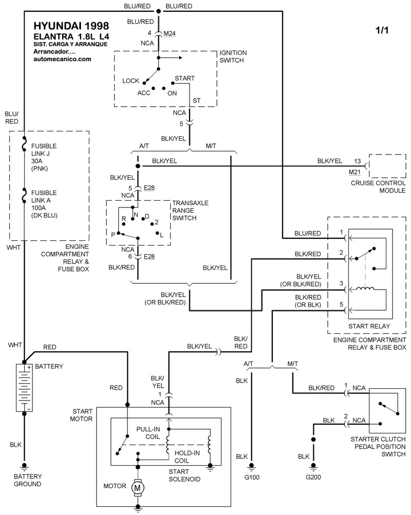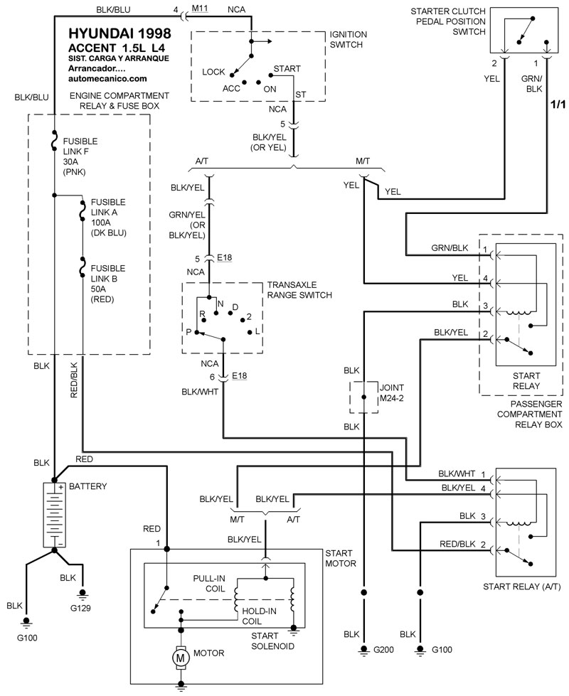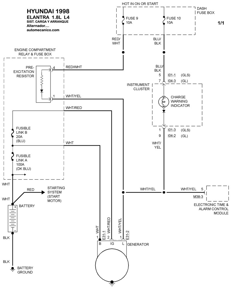 | Los Diagramas, listados abajo, se refieren unicamente al Circuito electrico que involucra: Alternador [Generador] y/o; Arrancador [Motor de arranque, Marcha, Starter] - INDICE: HYUNDAI - 1998 - |