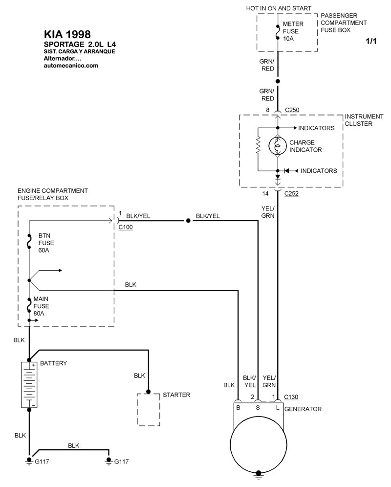 | Los Diagramas, listados abajo, se refieren unicamente al Circuito electrico que involucra: Alternador [Generador] y/o; Arrancador [Motor de arranque, Marcha, Starter] - INDICE: KIA - 1998 - |