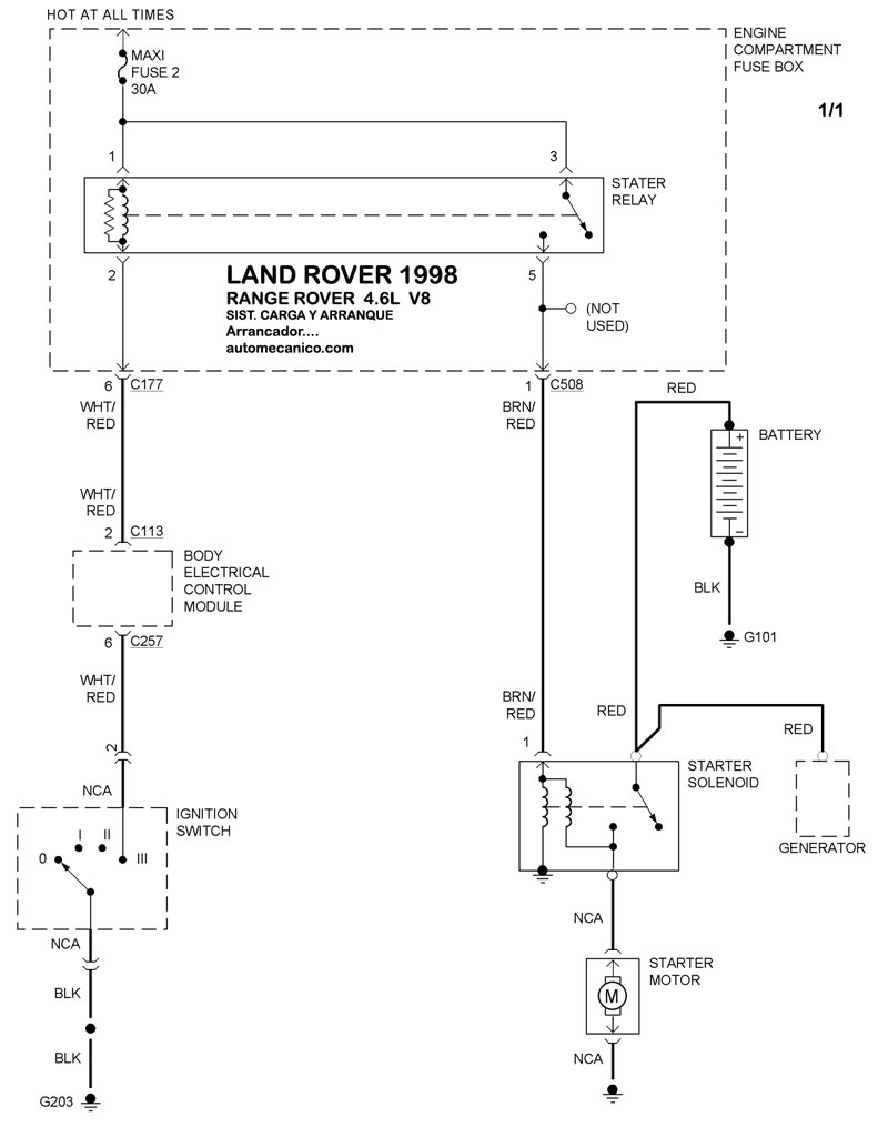 | Los Diagramas, listados abajo, se refieren unicamente al Circuito electrico que involucra: Alternador [Generador] y/o; Arrancador [Motor de arranque, Marcha, Starter] - INDICE: LAND ROVER - 1998 - |