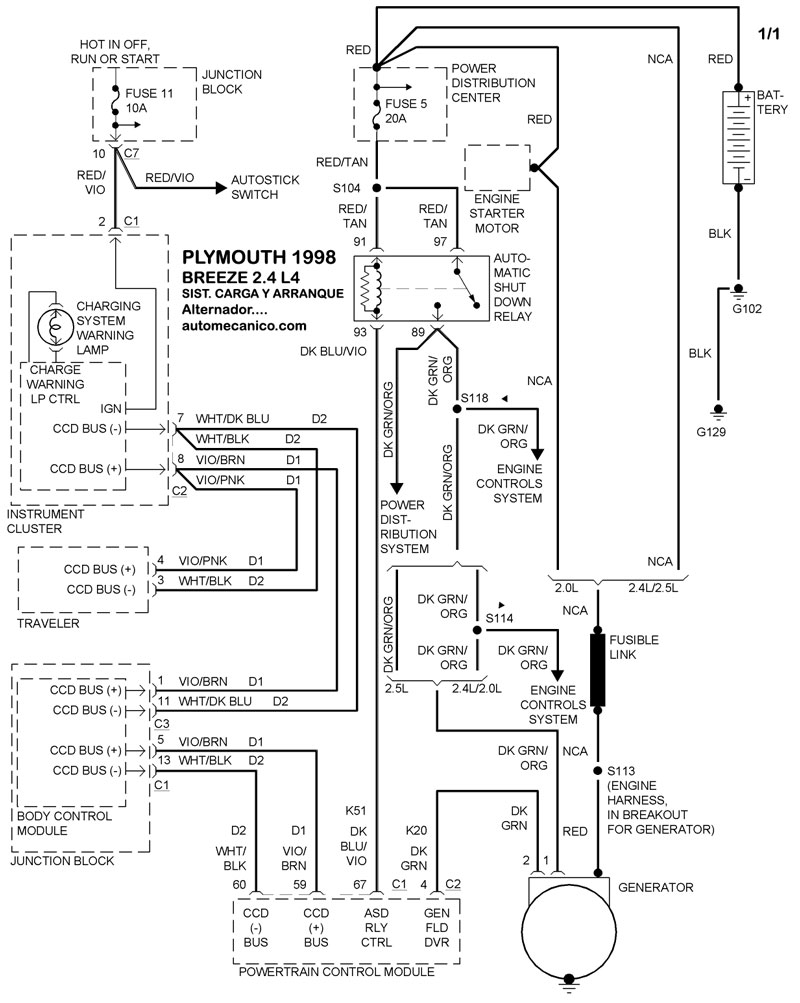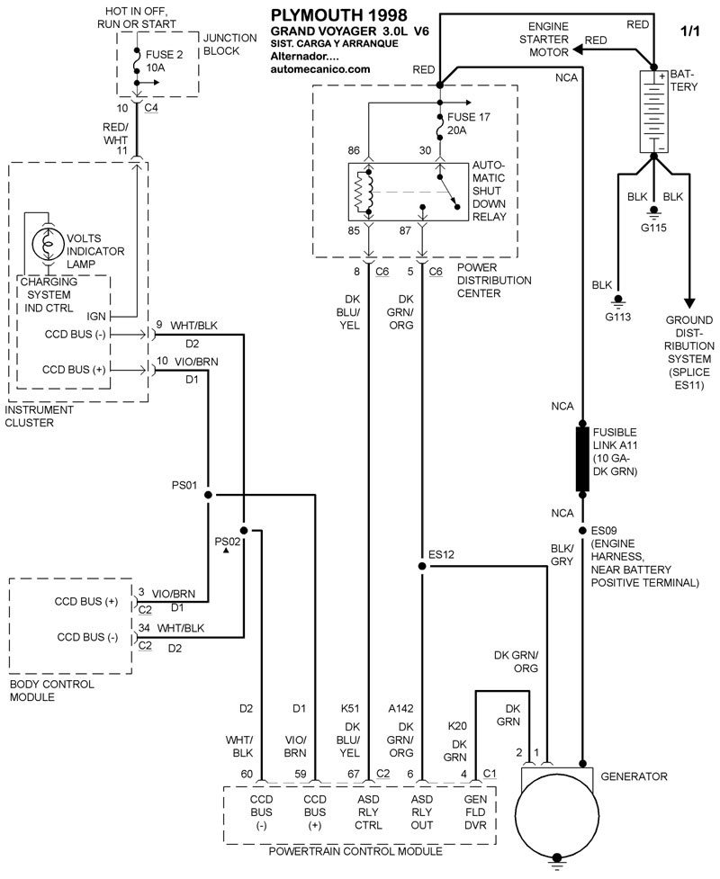 | Los Diagramas, listados abajo, se refieren unicamente al Circuito electrico que involucra: Alternador [Generador] y/o; Arrancador [Motor de arranque, Marcha, Starter] - INDICE: PLYMOUTH - 1998 - |