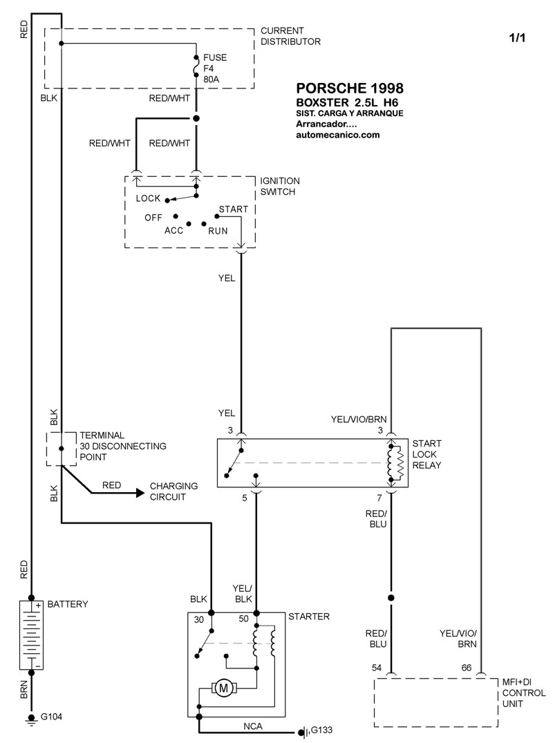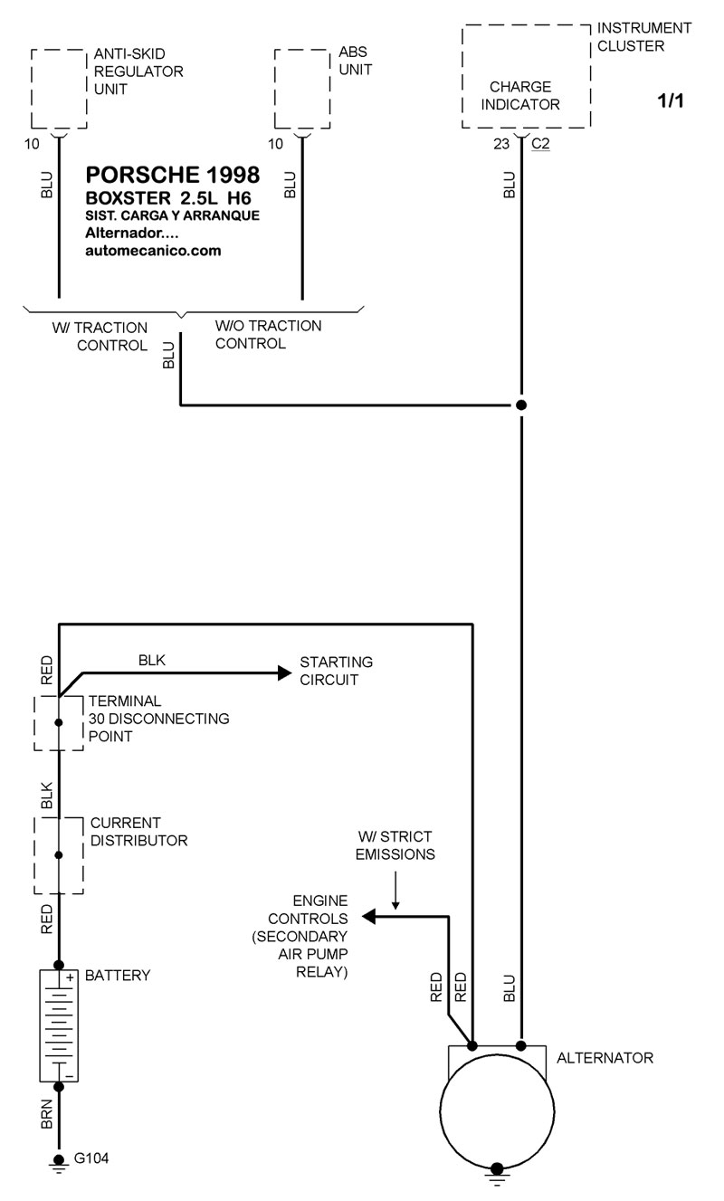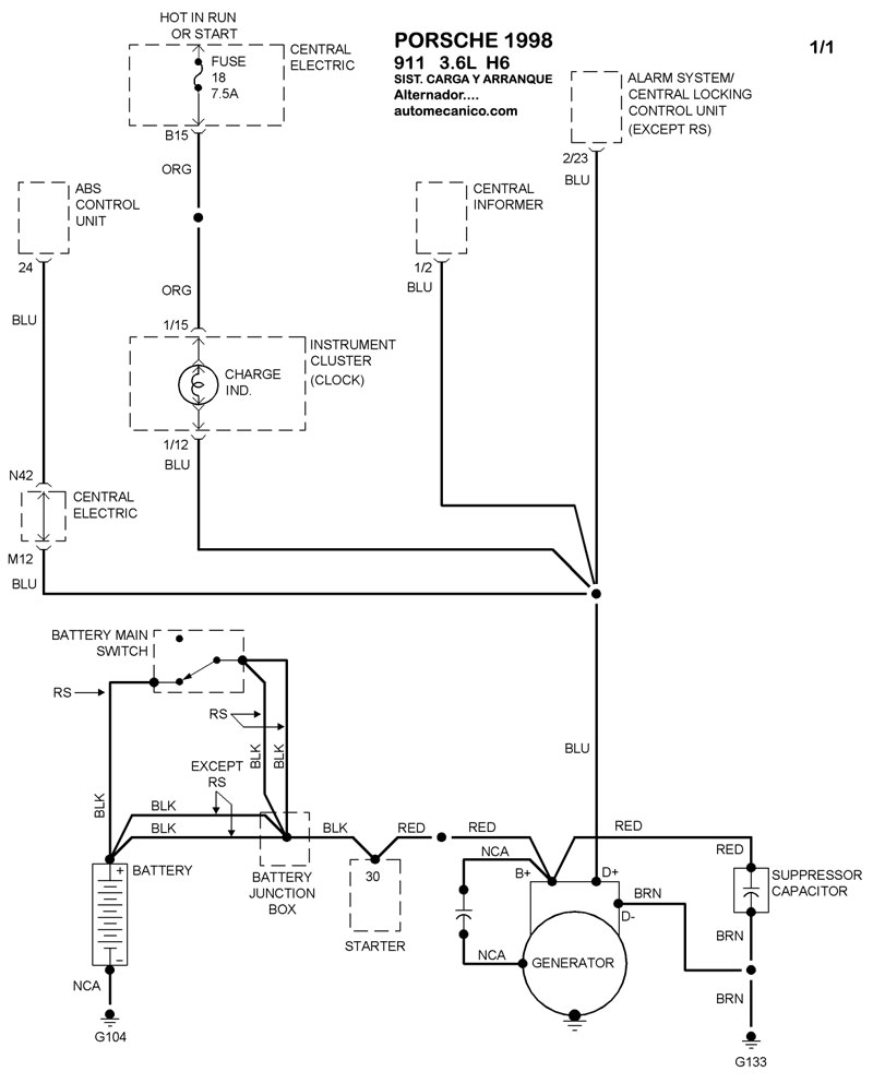 | Los Diagramas, listados abajo, se refieren unicamente al Circuito electrico que involucra: Alternador [Generador] y/o; Arrancador [Motor de arranque, Marcha, Starter] - INDICE: PORSCHE - 1998 - |