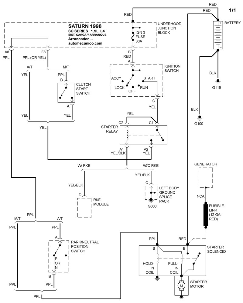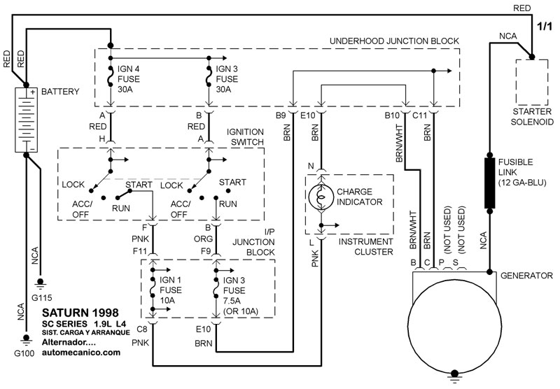 | Los Diagramas, listados abajo, se refieren unicamente al Circuito electrico que involucra: Alternador [Generador] y/o; Arrancador [Motor de arranque, Marcha, Starter] - INDICE: SATURN - 1998 - |